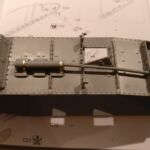 If you have never built a WWI tank before and only done WWII or later you’re in for a history lesson in early armour manufacturing, i.e. bolted steel plates. You don’t get a bathtub style lower hull in this kit, no, you have to assemble separate plates into the main hull that the two rhomboid track sides later attach to. Make sure you attach each plate to the next correctly, otherwise you’ll end up with fit problems down the line, especially when you build the sponsons! Be careful, take it slow and dry fit by using masking tape to hold the pieces together. Also be careful where you put your fingers because you are gluing large plates to each other and it’s easy to leave a finger print in the cemented pieces… I did on one place and it took a fair bit of work to fix. Completely my fault so be careful.